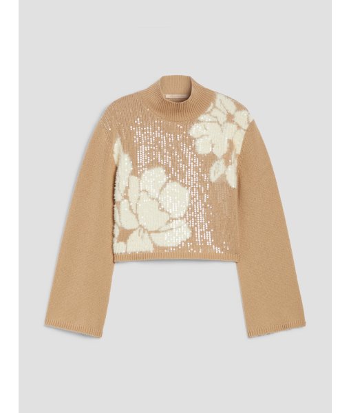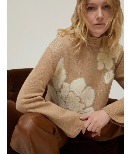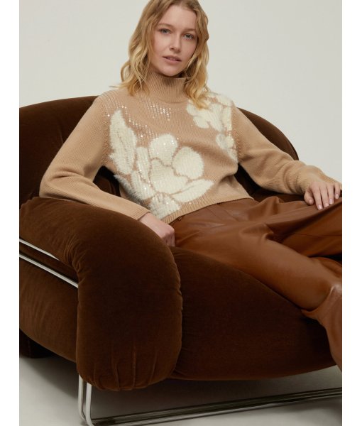 Per rischiarare e riscaldare le giornate invernali con unabbondante dose di stile, sulla maglia dal taglio cropped sbocciano fiori soffici e si accendono riflessi luminosi.