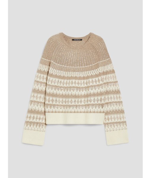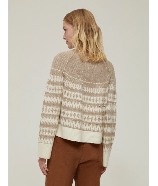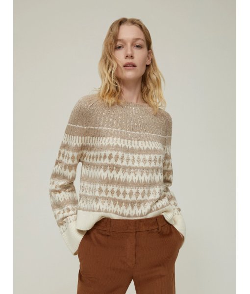 La maglia jacquard a motivi geometrici ha tutto il fascino del tricot nordico e un tocco in più: arricchita da riflessi scintillanti, accenderà ogni look.