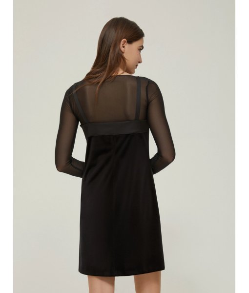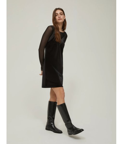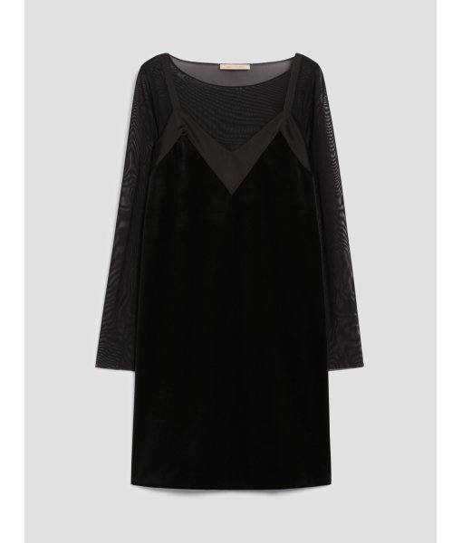 Contrasti di texture in nero totale: labito in jersey velluto è rifinito in raso e accompagnato da una T-shirt in tulle per giocare con le trasparenze. Chic, per la sera e i party.