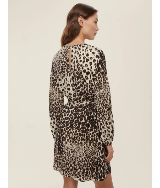 Nuova interpretazione del wrap dress, con fusciacca che si annoda lateralmente e disegna la silhouette. Lunghezza sopra il ginocchio e stampa animalier black and white per un carattere deciso.