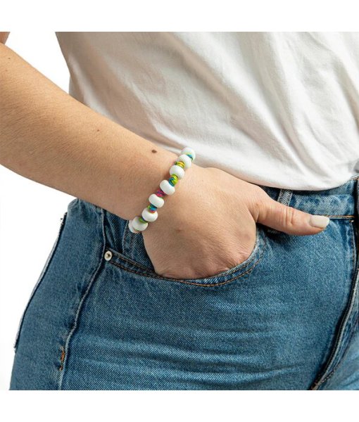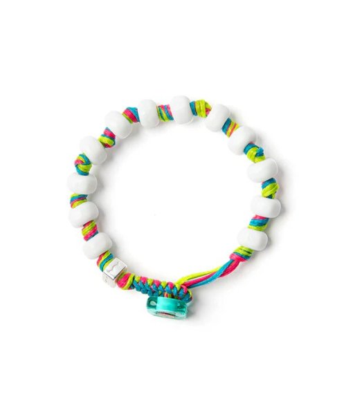 Braccialetto per uomo e donna con cordoncino in poliestere cerato multicolor verde, azzurro e fuxia, gocce bianche in vetro lavorato a lume, disco di chiusura verde acqua trasaprente e dado in argento.