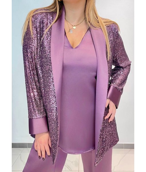 Giacca destrutturata in pailettes con collo sciallato e polsini in raso