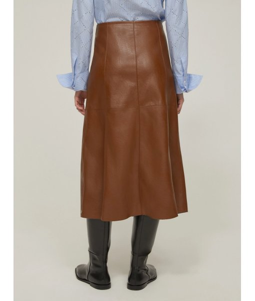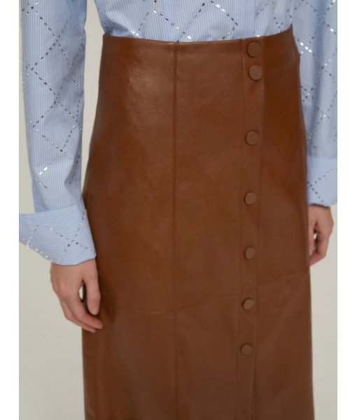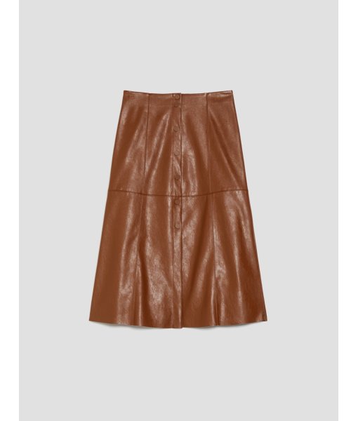 La gonna midi dalla silhouette bon chic sceglie un jersey dal grintoso finish spalmato: combinazione vincente.