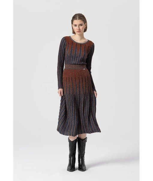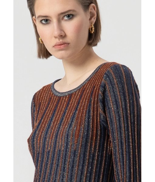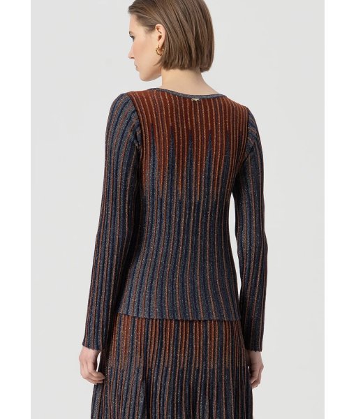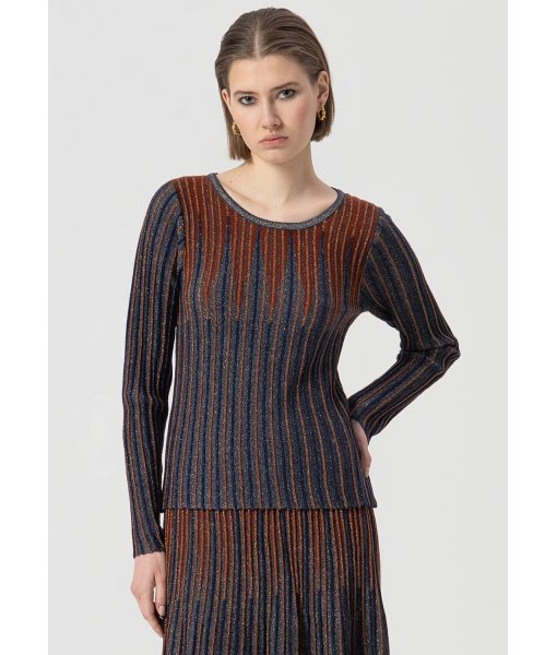 Maglia slim a coste con lana e lurex, girocollo, e con maniche lunghe.