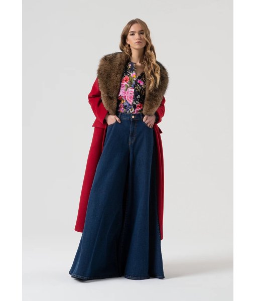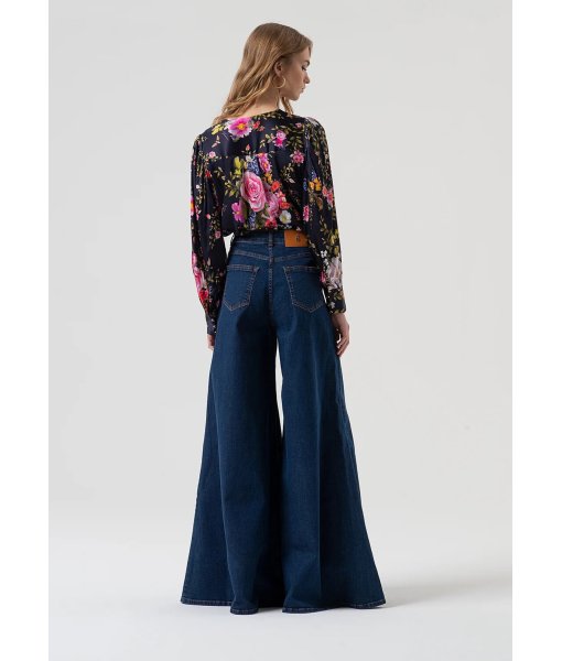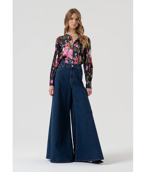 Jeans super flare in denim con lavaggio scuro, vita regolare, 5 tasche, e con fondo ampio.