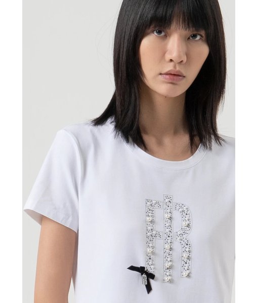 T-shirt regular in jersey di cotone, girocollo, logo con perle e strass centrali, e con maniche corte.